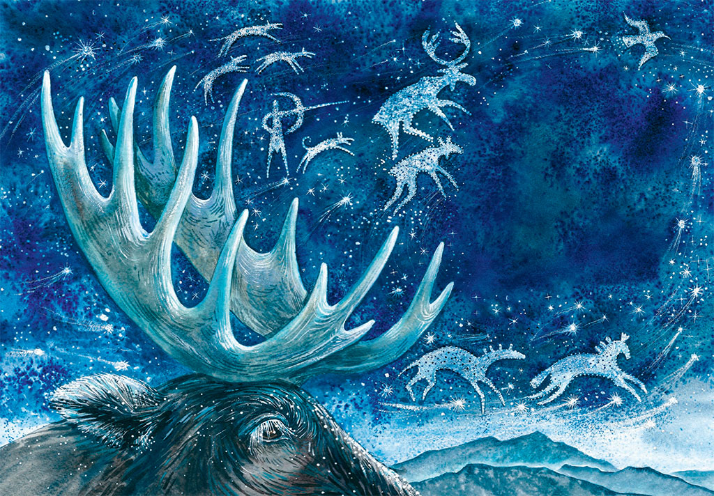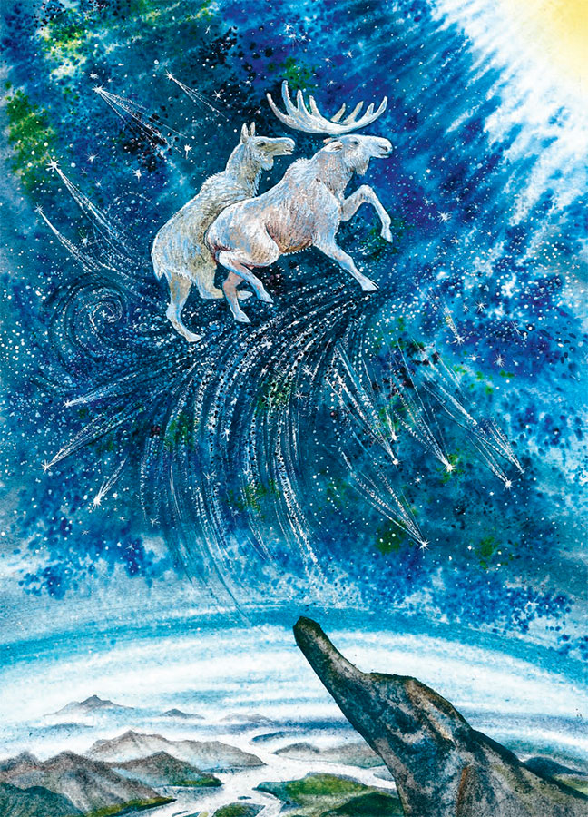 Тогда они решили разделаться с надоедливым светилом и поспешили на высокую остроносую гору. Теперь этой горы уже нет на свете, но во времена Буги и Эннын, взобравшись на неё, земные обитатели могли допрыгнуть до самого неба. Лоси взбежали на вершину горы, оттолкнулись от её края и оказались на линии горизонта. Пробежав по ней круг, охотники за Солнцем стали подниматься выше по тонкой дорожке Млечного Пути, оставляя после себя искрящийся столб звёздной пыли. Топот их копыт разбудил стаю комет, спящих на краю небосвода. Они зажгли свои хвосты и разлетелись по небу, чтобы разнести во все стороны света нехорошую новость: