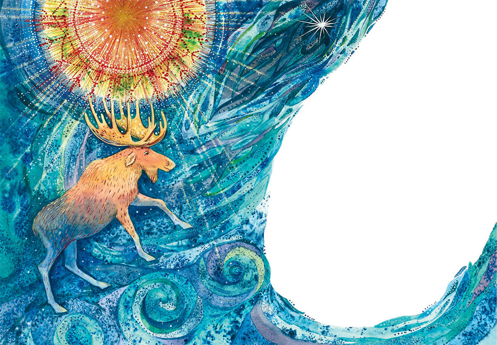 Давным-давно, когда мир был ещё маленьким и хрупким, а Солнце не сходило с небосвода, лось по имени Буга и его подруга – лосиха Эннын решили немного вздремнуть. Они устроились под молодой лиственницей, и, как только закрыли глаза, солнечные лучи тут же принялись щекотать их носы и отпугивать от них сновидения. Лоси долго вертелись да ворочались, но так и не смогли уснуть.