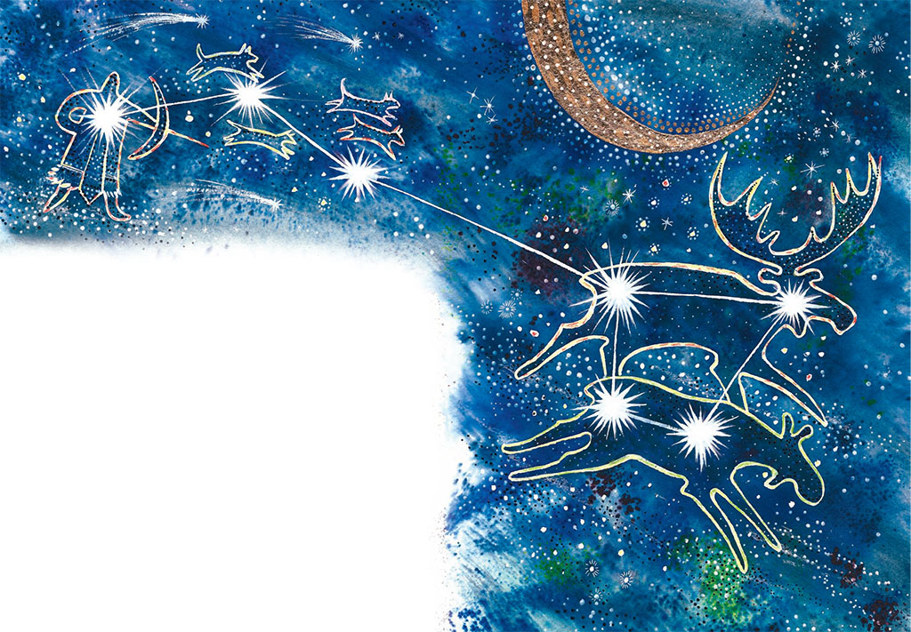 Охотник пронёс светило через весь небосвод, держа его высоко над головой, чтобы не ослепнуть. Но как только он выпустил его из рук, небо тут же озарилось семью яркими вспышками. На мгновение обитатели земли зажмурились, а когда вновь открыли глаза, то увидели, что Буга, Эннын, Мани и четыре охотничьих пса превратились в звёзды. Те, кто видел это своими глазами, назвали их созвездием Лося[1].