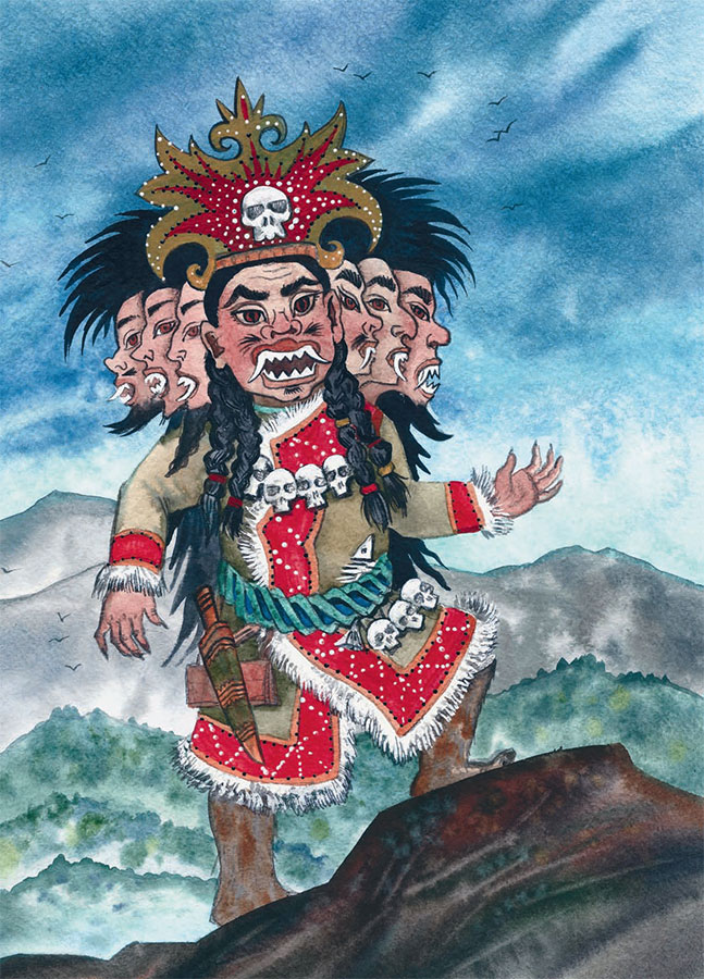 Давным-давно, по ту сторону прошлого, по эту сторону настоящего водился на земле великан Джелбеген. Он был сыном владыки подземелья Эрлика. Как и других своих детей: жаб, ведьм, насекомых и чудовищ, он слепил Джелбегена без любви и старания. Великан не знал ни ласки, ни заботы, не слышал добрых слов и не видел ничего хорошего. Оттого Джелбеген стал очень свирепым и жестоким. У него было семь голов с семью зубастыми ртами и бездонный желудок. Голод его был бесконечен. Чем больше ел великан, тем сильнее ему хотелось есть. Целыми днями Джелбеген искал, чем бы поживиться. Поедал он всё подряд: от грибов и комаров до стариков и детей. В те времена среди людей ещё не появился богатырь, способный сравниться по силе с прожорливым великаном, и никто во всём свете не мог остановить Джелбегена.