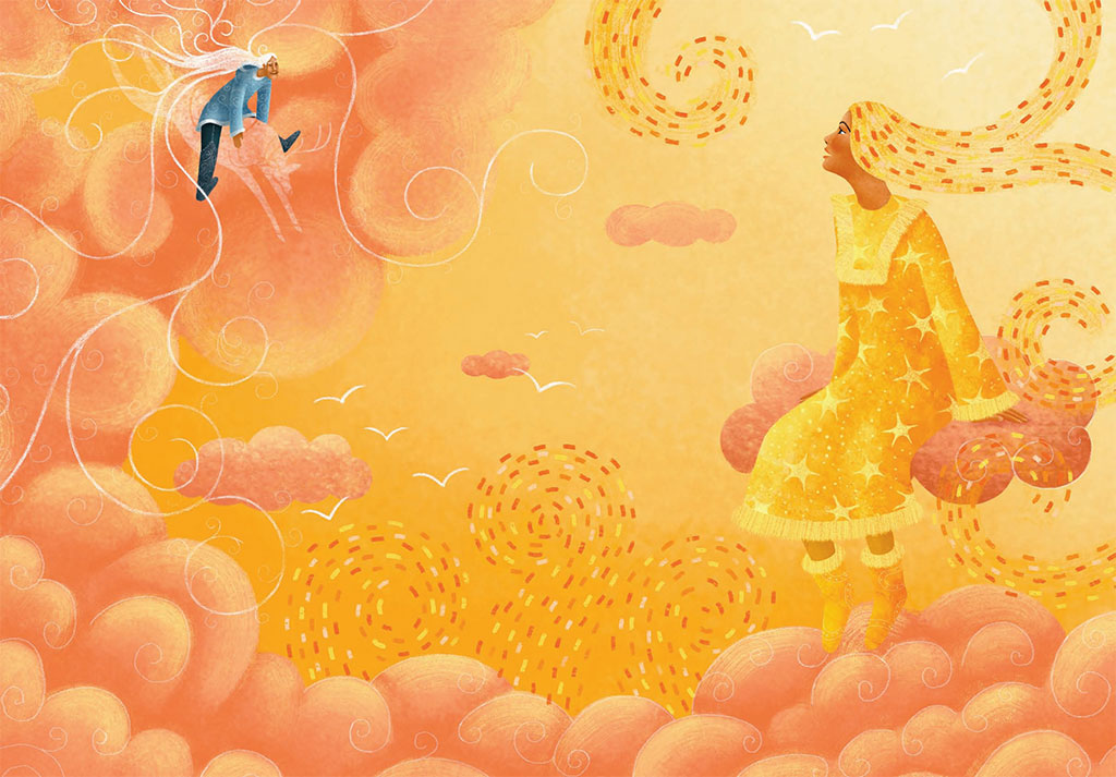 Но вот на небе показался Балакитг, и яркий румянец вспыхивает на щеках Завины. Богатырь подлетает совсем близко, садится на облако рядом с ней и протягивает ей маленький кожаный мешочек. Завина спешит поскорее заглянуть в него: на дне мешочка сверкают сплетённые из бисера и птичьих перьев узоры самых красивых историй, которые подслушал ветер, кружась над людскими селеньями. Одну за другой красавица берёт в руки вышивки с историями и вглядывается в каждую из них. Вдруг её внимание привлекает самая блестящая, самая искусно сплетённая вышивка.