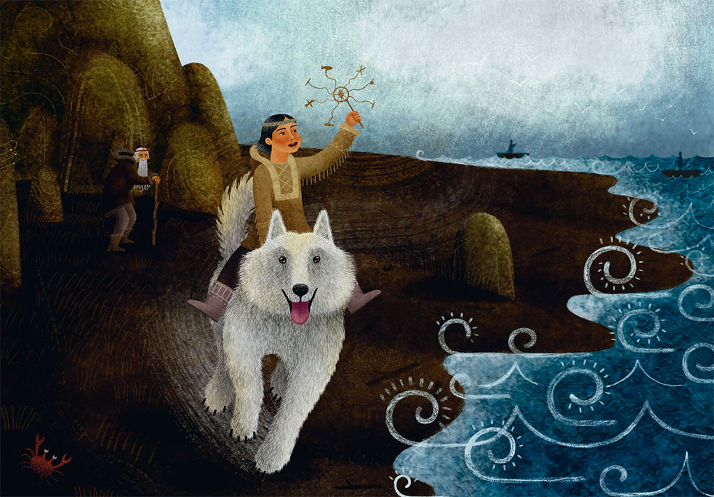 Шло время, полнела и истончалась луна, пролетали одна за другой ночи, Алаид потихоньку подрастал. Вот он не выше куста сара́ны[2], и у него уже есть настоящий друг – белый, как снег, и очень добрый пёс по кличке Коско. Каждый день, едва проснувшись, мальчишка хватал звонкий танке́л[3] и, задевая им висящие под потолком верёвки с ю́колой[4], бежал на улицу. Там его уже ждал Коско, поскуливая от нетерпения. Алаид ловко запрыгивал ему на спину и, разрезая воздух звонким треском танкела, мчался по чёрной линии берегового песка, распугивая чаек и нарушая покой сосредоточенных рыбаков, готовящихся выйти в море.