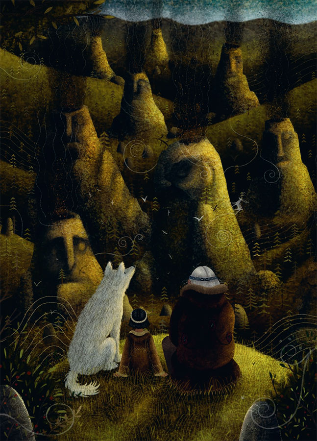 Лишь на рассвете они оказались на вершине невысокой покатой сопки, с которой было видно уходящую в море долину огнедышащих гор. Сердце Алаида замерло от страха и восторга. Столбы чёрного дыма тянулись высоко до самого неба, и мальчику казалось, что это колышутся на ветру длиннющие бороды великанов, спрятавшихся в густых облаках.