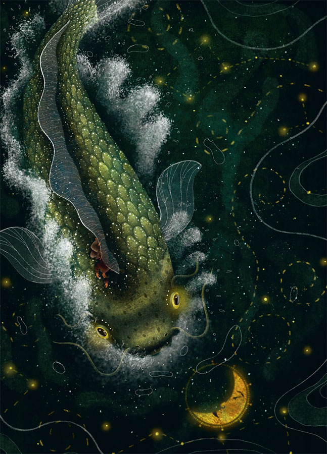 Алаид очнулся, когда на небо выкатилась луна и рассыпала повсюду колючие и блестящие, как рыболовные крючки, звёзды. Открыв глаза, Алаид увидел, что лежит на спине огромной рыбы посреди спящего океана. В ярком лунном свете рыбья чешуя мерцала и переливалась цветом морской волны. Через длинную полупрозрачную ширму плавника на спине Алаид видел, как смеётся в небе луна.