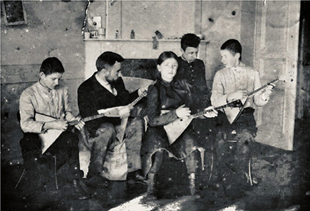 Домашние уроки музыки. Слева направо: Петр, учитель музыки, Катя, племянник В.М. – Николай, Владимир