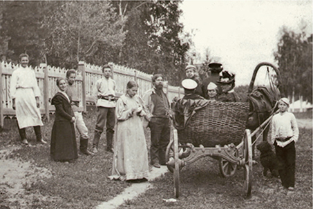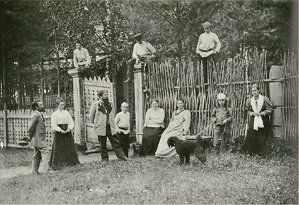 1899 г. На съемной даче в Курье. Справа от коляски – Петр, слева – Владимир Михайлович. В коляске – Наталья Петровна, Катя и Владимир. В темной одежде стоит Ольга. Остальные – неизвестны
