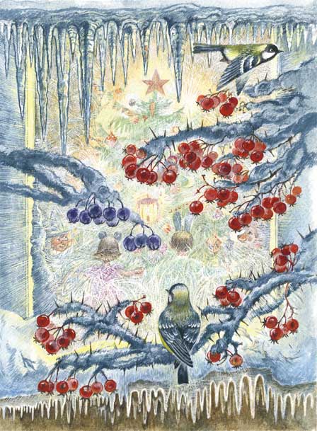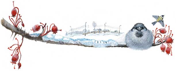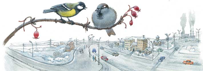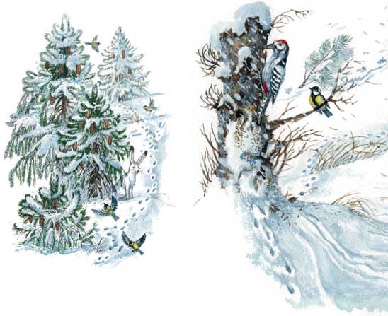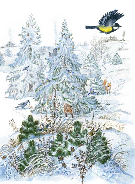 – Ну вот, запомни: январь – первый месяц года – начинается с весёлой ёлки у ребят. Солнце с каждым днём понемножечку начинает вставать раньше и ложиться позже. Свету день ото дня прибывает, а мороз всё крепчает. Небо всё в тучах. А когда проглянет солнышко, тебе, синичке, хочется петь. И ты тихонько пробуешь голос: «Зинь-зинь-тю! Зинь-зинь-тю!»