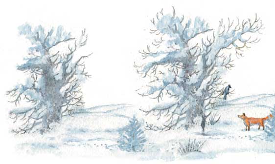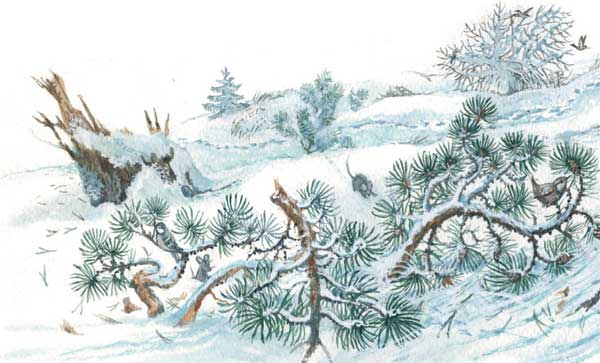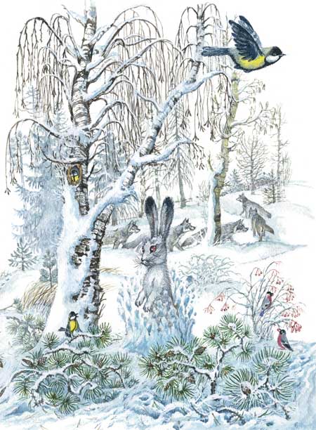День и ночь бушевала пурга, а когда улеглась и Зинька выглянула из дупла, она не узнала леса: так он весь был залеплен снегом. Голодные волки промелькнули между деревьями, увязая по брюхо в рыхлом снегу. Внизу под деревьями валялись обломанные ветром сучья, чёрные, с содранной корой.