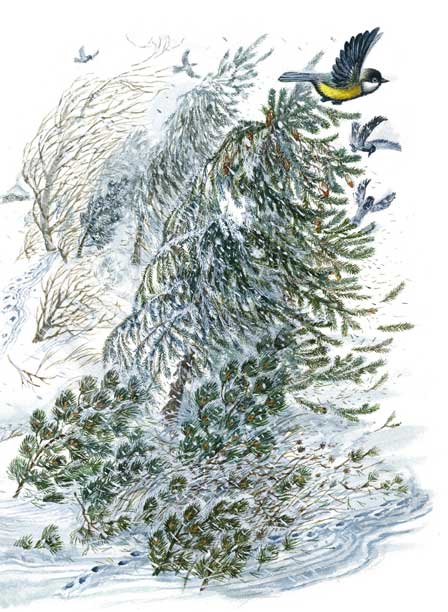 Зинька присмирела, сжалась в комочек, а ветер так и рвёт её с ветки, перья ерошит и леденит под ними тельце.