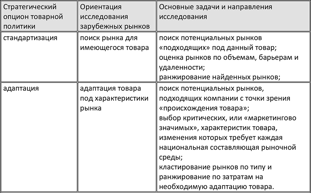 В настоящее время существует достаточно много методов исследований. При организации исследований, целью которых, например, является поиск возможностей для максимального использования производственных возможностей компании при осуществлении внешнеэкономической деятельности можно выбрать (табл. 1) два основных подхода, соответствующих двум крайним альтернативам товарной политики компании.