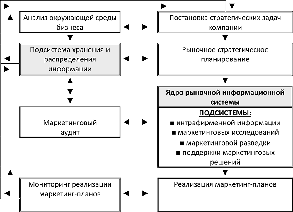 Поэтому на рис. 1.1. блок «Ядро рыночной информационной системы» находится в прямом и обратном взаимодействии, отображаемом соответствующими черными и серыми стрелками, с другими блоками. В верхней части схемы ИС (от блока «Анализ окружающей среды» до блока «Рыночное стратегическое планирование») отображена включенность системы ИС в процесс стратегического планирования, в ходе которого процесс планирования переходит также и на оперативный уровень, где происходит выбор конкретной формы бизнес-операции, с которой компания будет выходить на зарубежный рынок. Соответствующие корректировки этого процесса также осуществляются при помощи информации, описывающей текущее состояние самой компании (блок «Маркетинговый аудит»). В нижней части схемы ИС (блоки «Мониторинг реализации маркетинг-планов» и «Реализация маркетинг-планов») отображена включенность системы ИС в процесс оперативного управления реализацией текущих планов.