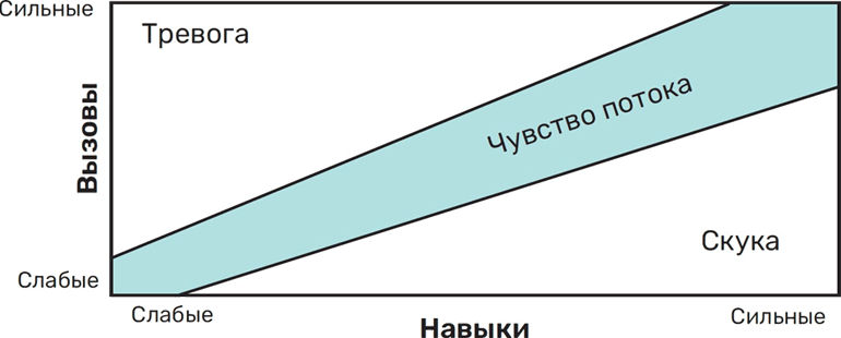 И, как мы видим, не такой уж широкий у нас туннель состояния потока, где есть возможность чувствовать себя счастливым, благополучным и реализованным, когда наши ресурсы и навыки уравновешиваются вызовами. Причем обратите внимание: если мало навыков, недостаточно внутреннего ресурса, то и размах вызовов, с которыми вы можете справиться, будет ограниченным. Но тренировка и адаптация в том и заключаются, что шаг за шагом мы постепенно развиваем свои навыки – как профессиональные, так и социальные, психологические – и становимся готовыми к встрече с более масштабными вызовами, которые стимулируют дальнейший рост и развитие. Состоянию потока можно найти объяснения и с точки зрения нейробиологии: адреналин и норадреналин помогают преодолевать трудности, обучаться, достигать новых высот, ведь на любые свершения нужна энергия и активность; а с другой стороны, мы испытываем предвкушение удовольствия и положительные эмоции от достижений – и это ощущение счастья нам дарят дофаминовая и серотониновая системы мозга. В результате возникает чувство потока, ощущение легкости, несмотря на затрачиваемые усилия и труд.