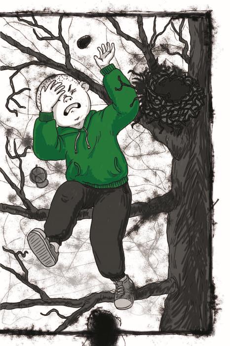 Мальчик не удержался и полетел вниз, размахивая руками. Он с трудом ухватился за одну из веток и повис. Голова у него разболелась, нос заложило.