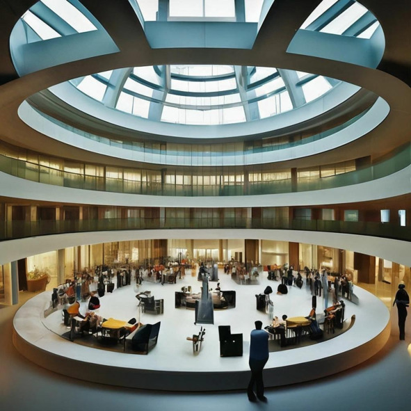 В зале был очень высокий потолок. По бокам вели лестницы на этажи, каждый этаж был ограждён перилами, они были прозрачными, как будто стеклянными. Всего было пять этажей, на каждый этаж вышли люди, многие спустились в зал. Некоторые зашли с боковых дверей, таких дверей было несколько.
