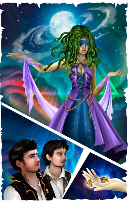 Вновь воцарилась тишина, спокойствие и темнота. Из всех трех фонарей, находящихся на палубе, горел только один, зато очень ярко. Этого хватило, чтобы от него по кораблю прошлась тень, которая становилась длиннее и шире. Эта тень заполнила палубу и наконец, перестав расти, начала собираться в единый большой шар, который постепенно возвышался и становился объемнее. На тени начало виднеться какое-то загадочное существо. Все, завороженные страхом и интересом, не могли оторвать взгляды от этого чуда. Когда «превращение» закончилось, это уже была не тень, а горгона! Вот только совсем не такая, как ее обычно описывают. Нет! Глаза закрыты темно-синей повязкой, которая слегка светилась мелкими звездочками. Ее главное оружие – змеи – сами с закрытыми глазами и оплетенные водорослями, просто висели на ее плечах, как волосы. Кожа была как у человека, но с зеленцой и испещрена какими-то незнакомыми письменами, похожими на иероглифы. Уши как у эльфа, платье синее, с фиолетовым корсетом.