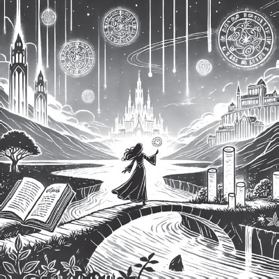 По приставной лесенке девушка поднялась на выбранную страницу. Шла Лиза над бездной Времени по красивому плетёному мостику, конца которому видно не было. Этот мостик не перекинут, как обычно, с берега на берег, а простирается вдоль реки и, скорее, похож на смотровую площадку. Заболоченная у основания, эта таинственная река чем дальше, тем больше набирала разбег: мелькали события и даты. Какие-то призрачные существа, похожие на больших и маленьких птиц, взлетели стаей над головой, туманом из реки поднялись белёсые змеи, длинные тени грифонов по дальнему берегу реки тоже пугали кроткую девушку. Но она знала, куда и зачем идёт, собралась с мыслями и старалась держаться ближе к стенке страницы. Визуально и на ощупь страница напоминала высокий бревенчатый забор, сколоченный из каких-то гигантских деревьев, и была для Лизаветы спасением в неведомых приключениях.