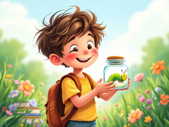 Его друзья одноклассники однажды всей толпой играли в телефоны, а он тем временем что-то высматривал в траве. Он там обнаружил очень красивую гусеницу и показал её своим друзьям.