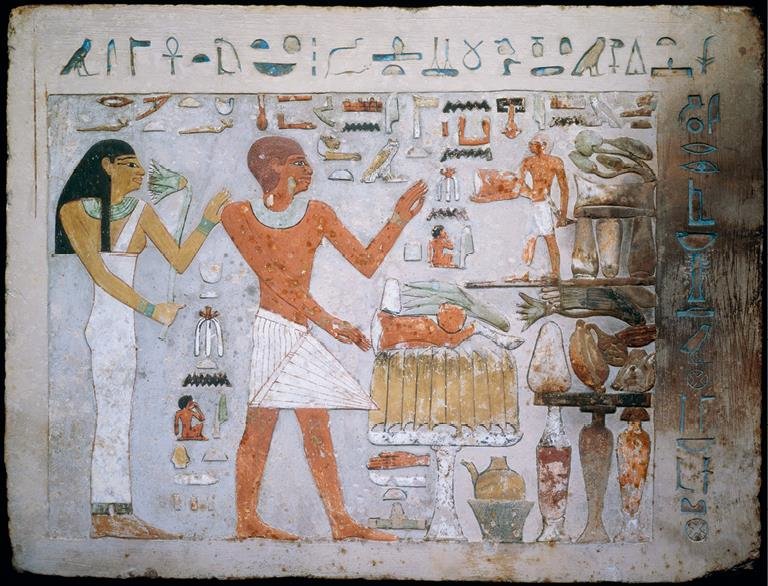 На фреске фараон изображён со своей женой Хемет (мы знаем их имена благодаря многочисленным надписям, которые традиционно сопровождают египетские изображения). Перед ними стоят столы с дарами – хлебами, овощами, ногой и головой какого-то животного. Присмотримся к фигурам внимательнее.