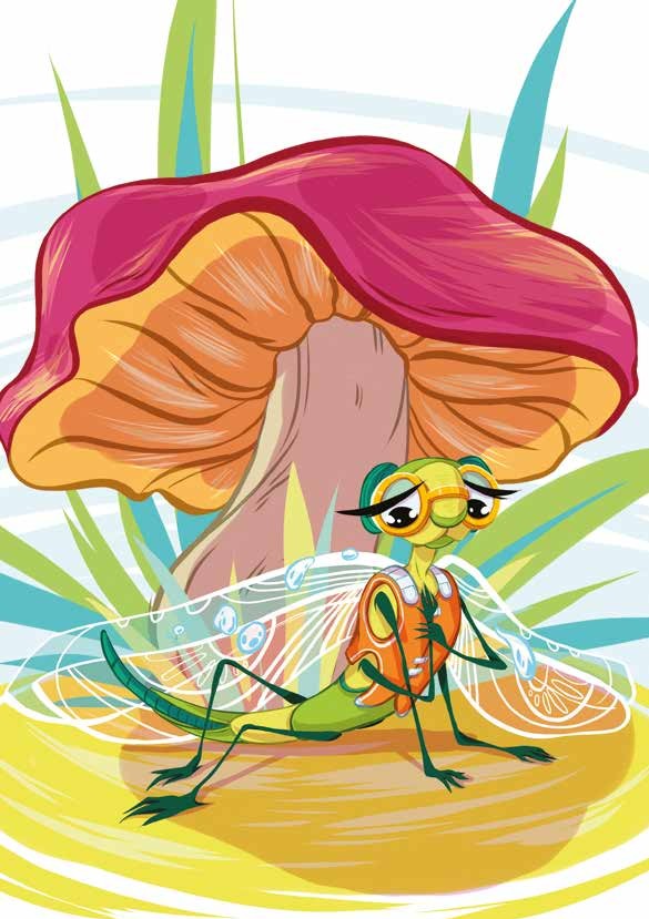 – Слышишь? – обратилась она к Лямке. Лямка тоже прислушалась. Где-то совсем близко послышался слабый стон. Каня заглянула под гриб и увидела стрекозу. Крылья у неё все промокли, а лапка была повреждена. Стрекоза опять застонала.
