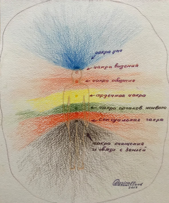 На рисунке я изобразила биополе в спокойном состоянии. Но оно тут же придет в движение, если начнет функционировать одна или несколько чакр для того, чтобы допоставить в него какое-то недостающее количество потраченной энергии. Все энергии входят в биополе волнами, причем у каждой из семи энергий своя форма волн.