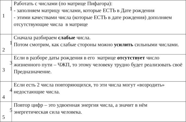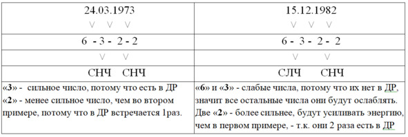 Таблица 7. Разбор даты рождения. Сильные и слабые числа даты рождения.