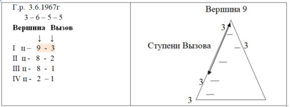 1. 1 Вершина (I цикл) —Др+Мр/14 +9=1+4 = 5 +9 =14 =1+4 = 5 → 52. 2 Вершина (II цикл) – Др + Гр/ 5 +3= 8→83. 3 Вершина (III цикл) — 1 Верш +2 Верш = 5 +8 = 13 = 1 +3 = 4 →44. 4 Вершина (IV цикл) – Мр + Гр / 9 +3 =12 =1 +2= 3→35. 5 Вершина (V цикл) – 3 Верш +4 Верш = 4 +3 =7 →76. 6 Вершина (VI цикл) — 4 Верш +5 Верш = 3 +7 = 10 = 1 +0 = 1 → 1В Карте записываем так:Г.р. 14.09.19655— 9 – 3 – 8Вершина Вызов ↓ ↓I ц – 5 —II ц – 8 —IIIц —4 —IV ц —3 —V ц – 7 —VIц —1 —Таблица 12. Карта Вершин по жизненным циклам.