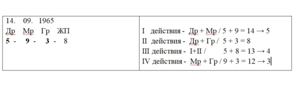 1. 14 = 1+4 = 5 – Др2. 09 = 9 – Мр3. 1965 = 1+9+6+5=21=2+1 = 3 – Гр4. 5 +9 +3 = 17 = 1 +7 = 8 – ЖПВершины – все числа складываем.