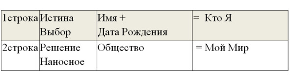 Правила общества, это не ваша жизненная задача – это «наносное». Они как бы «наносятся сверху» вашей основной задачи. Поэтому, через общество, в котором мы живем, мы решаем свои задачи и строим «Свой Мир» в нём (вторая строка таблицы).