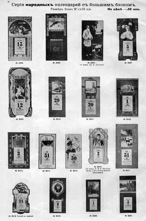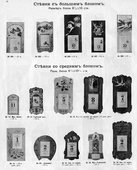 К концу XIX века выпуском печатных календарей в России занимались больше сотни частных типографий. На самого широкого потребителя был рассчитан «Общеполезный календарь» Ивана Сытина (выходил с 1889 по 1918 год). Культурная публика предпочитала «Крестный календарь» (выходил с 1865 по 1918 год) Алексея Гатцука, писателя и ученого, или «Русский календарь» (выходил с 1872 по 1916 год) талантливого журналиста Алексея Суворина. «Современный календарь» (с 1889 по 1909 год) Алексея Ступина предлагался менее взыскательным читателям, а «Всеобщий календарь» Германа Гоппе исходил из интересов городской публики (выходил с 1868 по 1899 год). «Календарь для всех», выходивший с 1907 по 1917 год под редакцией Ивана Горбунова-Посадова, известного народолюбца и последователя Льва Толстого, был адресован интеллигентным людям (то есть тем, кто радеет о судьбе народа). Людям деловым адресовались календарные издания Отто Кирхнера, основавшего в последней трети XIX века полиграфическую фабрику в Петербурге (там печатались календари, ежедневники, записные книжки).