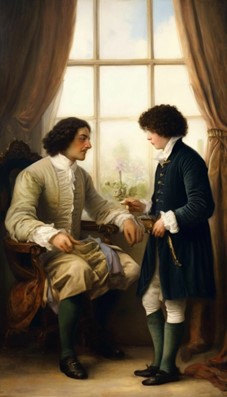 Отец, высокий и плечистый, сидел рядом. Когда он двигался, то золото вышивки на обшлагах его тёмно – синего кафтана царапало бархат, а новые кожаные сапоги поскрипывали. Сын не смел поднять глаз на его широкое, обветренное лицо, а сидел, уставившись на шляпу, лежавшую у отца на коленях.