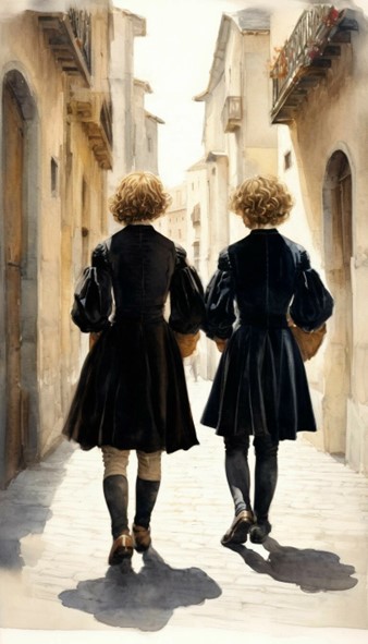 С двух сторон улицы пролегали сточные канавы. Напротив входов в дома через них были переброшены мостки. В канавах текла жёлто – зелёная вода, тащившая с собой ветки, пищевые отбросы, рваные башмаки и прочий мусор. Малыши пускали в канавах кораблики и палками измеряли их глубину. Когда по улице проехала карета, Друд и Мерей едва успели перебежать через мостки, чтобы не попасть под колёса.
