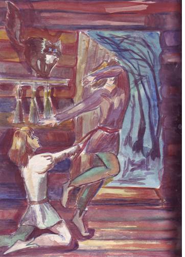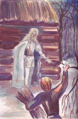 Избушку освещал лунный свет. Отодвинув серебряную от инея ветку, которая мешала как следует её разглядеть, я застыл в изумлении. Возле самой избушки ходил высокий юноша одного со мной возраста. Его светлые густые волосы падали на богато расшитый серебром голубой плащ, подбитый белым мехом. Я очень удивился. Как здесь очутился и что делает в лесу совсем один такой богатый юноша? Он меня тоже заметил и подошёл поближе.
