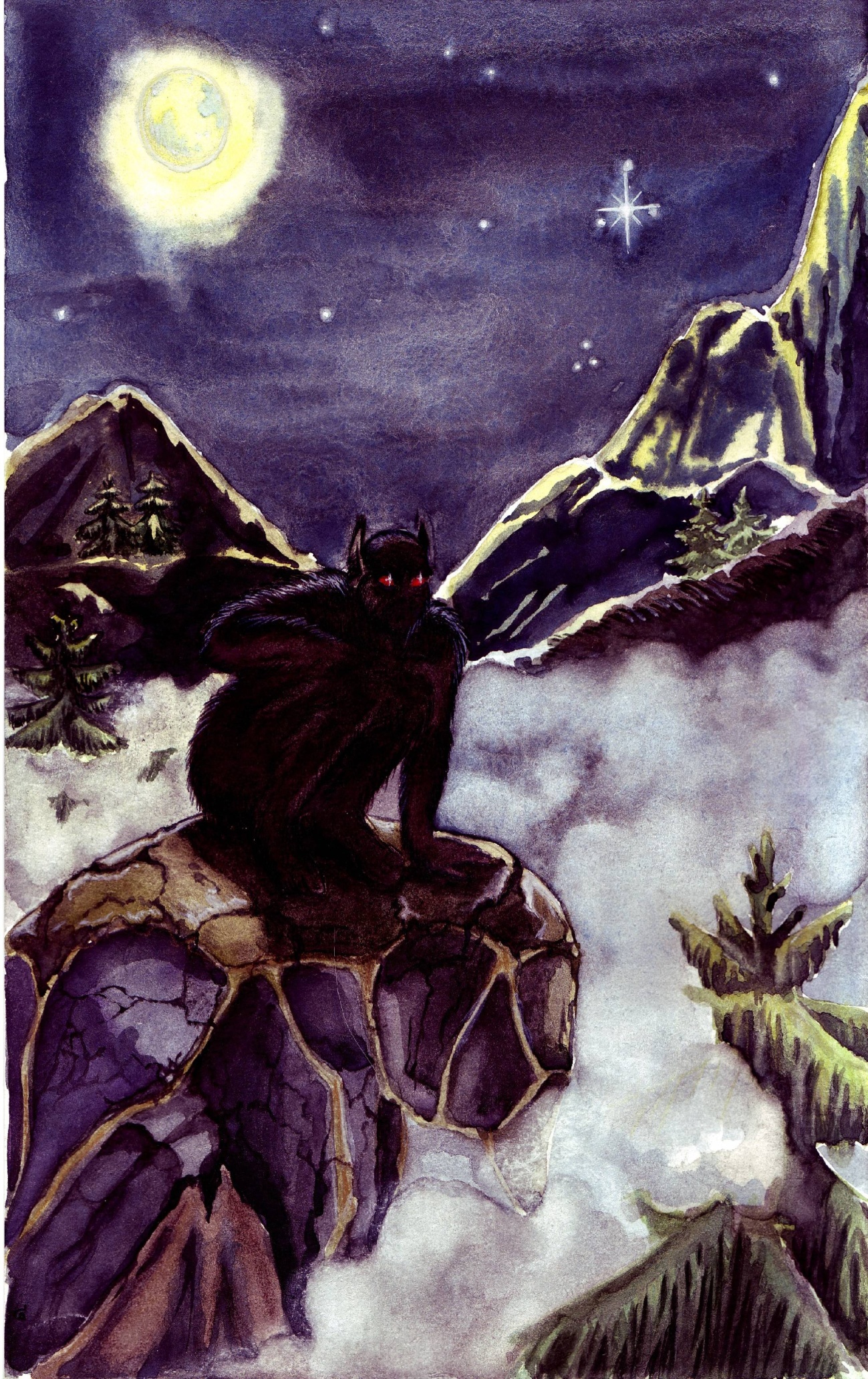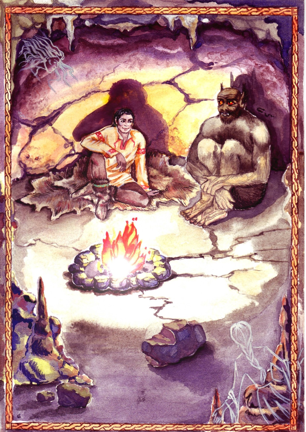 Проснулся Гюрд от того, что почувствовал чей-то взгляд. Факел уже наполовину догорел. Он увидел на некотором расстоянии от себя некое существо, сидевшее на корточках, поджав ноги. Огонь освещал его большие, переплетенные крупными венами ступни ног и такие же кисти рук, обхватывавшие колени. Казалось, это был человек. Увидев, что Гюрд его заметил, существо зашевелилось и сверкнуло красными, похожими на кошачьи, глазами. Юноша разглядел, что у него заросшая шерстью голова и лохматые острые уши. Он нисколько не испугался.