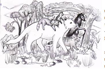 Не успели звери понять,в чём дело, как с ближайшей ветки дерева прямо под лапы впереди идущего барса упал незнакомый дикий кот и стал кататься по земле, давясь от смеха. Он то бил по земле всеми четырьмя лапами, то дрыгал ими в воздухе.