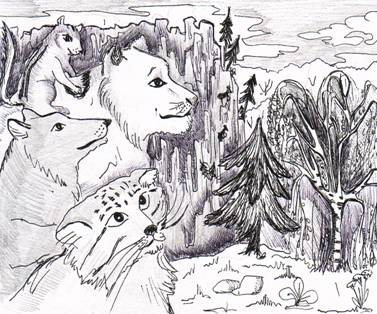 Закончив с едой, звери вновь отправились в путь. Лес вокруг был тёмный, еловый. Упавшие от старости ели образовывали завалы, поросшие мхом. Стволы растущих деревьев были покрыты лишайниками. Внезапно лес расступился, и на склоне холма звери увидели светлый, берёзовый лесок. В центре росла большая старая берёза, а вокруг неё располагались молодые берёзы и совсем юная берёзовая поросль.
