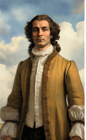 Маленький, с лицом, похожим на мордочку печальной обезьянки, он нервно ходит взад–вперёд по комнате, временами резко останавливаясь и вцепляясь пальцами, покрытыми чёрными волосками, то в край стола, то в спинку стула. Глаза его прищуриваются, угол рта скептически ползёт вниз, в то время как маленький закрученный ус указывает вверх. Могучий ум упрятан в тщедушное тело, жалкие очертания которого не могут скрыть ни расшитый алый кафтан, ни кружевное жабо, ни башмаки на высоких красных каблуках.