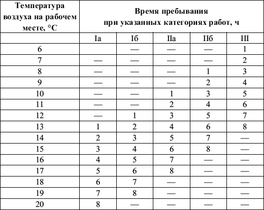 В целях защиты работающих от возможного перегревания или охлаждения при температуре воздуха на рабочих местах выше или ниже допустимых величин время пребывания на рабочих местах (непрерывно или суммарно за рабочую смену) ограничивается величинами, указанными в таблицах 9 и 10. При этом средне-сменная температура воздуха, при которой работающие находятся в течение рабочей смены на рабочих местах и местах отдыха, не должна выходить за пределы допустимых величин температуры воздуха для соответствующих категорий работ, указанных в таблице 9.