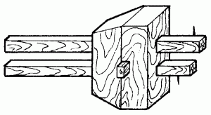СтуслоОно представляет собой подобие желоба, состоящего из трех досок. Две доски должны быть сбиты на основании параллельно друг другу, а угол между основанием и сторонами должен быть 45°. На сторонах стусла делают несколько специальных пропилов под определенным углом, причем их количество должно быть одинаковым с двух сторон. Линия с одной стороны доски должна продолжаться на другой так, чтобы было удобно распилить доску под определенным нужным углом.