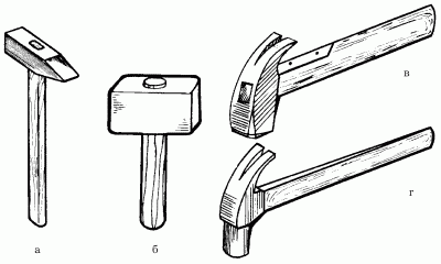 Рис. 11. Виды молотков: а – плотничный обычный; б – киянка; в – плотничный с квадратным обушком; д – плотничный с круглым обушком.
