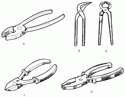 Рис. 12. Виды клещей: а – плоскогубцы; б – кусачки; в – клещи; г, д – пассатижи.