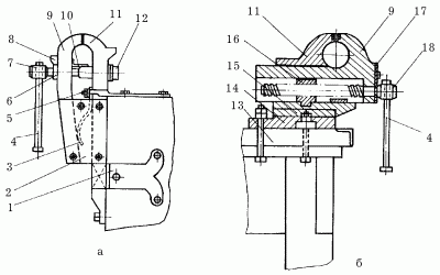 Рис. 14. Тиски: а – стуловые; б – параллельные: 1 – лапа для крепления тисков к верстаку; 2 – боковина; 3 – пружина; 4 – рычаг; 5 – планка для крепления тисков к верстаку; 6 – шайба; 7, 8 – стяжной и червячные винты; 8, 10 – козырьки; 9 – подвижная губка; 11 – неподвижная губка; 12 – втулка; 13 – верстак; 14 – нижняя плита; 15 – поворотный круг; 16 – гайка; 17 – крышка.