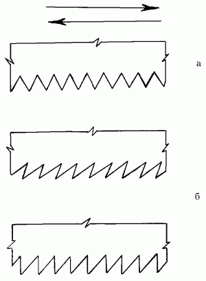 Зубья пил для продольной распиловки (рис. 15, а) короткой режущей кромкой перерезают волокна, а боковыми разделяют волокна между собой по их направлению. Зубья этих пил имеют прямую заточку, могут пилить только в одну сторону и по форме напоминают треугольник.
