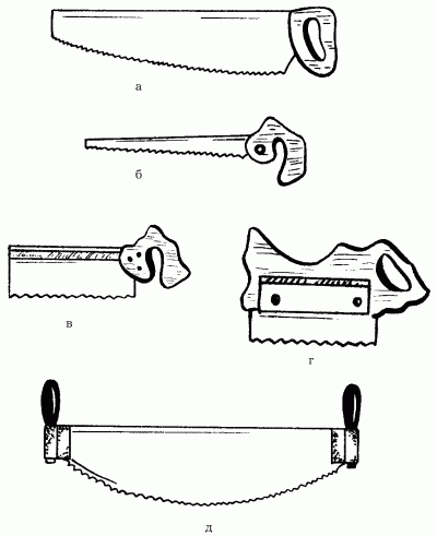 Рис. 16. Виды ножовок: а – поперечная широкая; б – узкая; в – с обушком; г – ножовка-наградка; д – двуручная поперечная пила.
