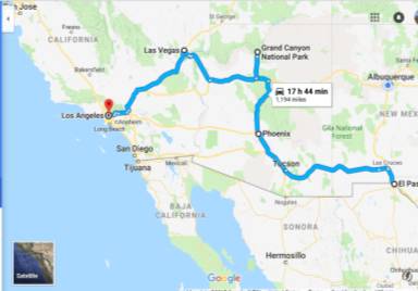Проехав ещё несколько часов и удивившись преодоленному расстоянию (уже Аризона!), я столкнулась с новой неожиданной проблемой. Солнце светило раньше в спину, но, постепенно смещаясь на запад, застигло – таки мой беззащитный левый бок через окно автомобиля (я к вечеру уже двигалась на север). И оказалось, что даже в шесть вечера солнце ещё очень сильное и буквально плавит… И кондиционер, охлаждающий воздух в машине, не влияет никак на эти прямые лучи. А уж встать в пробку в Финексе (конец рабочего дня, все домой поехали!) именно левой стороной к солнцу и вовсе не входило в мои планы. С трудом съехав с хайвея в первом доступном месте, я начала искать МакДональлс, так как меня предупредили, что там точно будет wi fi ( ну и еда заодно, конечно, и туалет). С тех пор, в отсутствие навигации, это заведение стало для меня лучшим другом. Выходя в интернет, я скринила карту предстоящего пути на планшет, делала фото в разных масштабах и потом по ним ориентировалась, куда ехать. Каменный век, и очень безответственно!))) как выяснилось позже. А пока быстро стемнело, гостиницей пришлось считать ближайшую жуткую ночлежку, недорогую правда, и уже можно было сделать кое- какие выводы. 1) в одиночку ехать можно, это не так уж и страшно, 2) бак бензина при такой скорости долго не заканчивается, а мили пролетают вихрем, 3) наказания за такую скорость (я порой ехала более ста миль, или 170 км, в час) при известном внимании и концентрации не ожидается, по крайней мере, в этом штате. Выводы позволили подтвердить свой амбициозный первоначальный маршрут: Эль Пасо, Финекс, Гран Каньон, Лас Вегас, Лос Анжелес, Финекс, Эль Пасо.