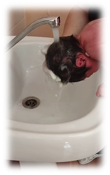 Затем смываем шампунь под струёй воды круговыми движениями.