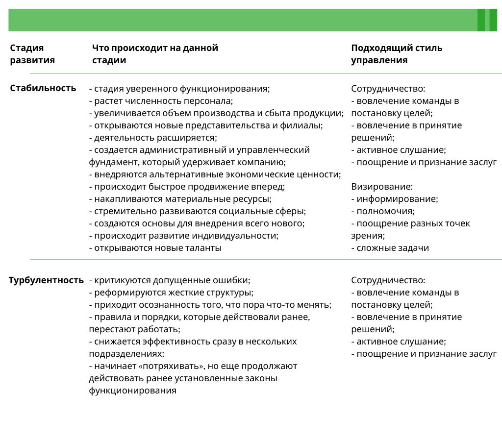 Мы видим параметры, которые отражают объективные причины, и для управления организацией в данных условиях руководителю требуется гибкость, в том числе в выборе подходящей модели лидерства. Другие причины носят субъективный характер. На данные параметры можно влиять управленческими действиями. Разберем подробно каждый параметр.