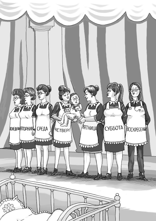 Когда малыш появился на свет, родители решили, что мама по‑прежнему большую часть времени будет проводить в другой стране, где учатся старшие дочери, – в этом возрасте им необходимо родительское внимание, – а сын останется в Москве под присмотром профессиональных нянь. Отбирали их тщательно, каждую строго инструктировали. Если няня была замечена в каком‑то проступке, ее тут же увольняли. Первую няню уволили за то, что подняла с пола соску и вытерла о фартук – неряха! Вторая имела наглость взять из холодильника просроченные йогурты: она видела, что их все равно выбрасывают. Но это заметили, и в результате няня была изгнана с позором: «воровка не может воспитывать нашего ребенка». Третья болтала по телефону, когда пришло время кормления; потом она объяснила, что просто не хотела будить малыша, ждала, пока он проснется, но была уволена за пренебрежение своими обязанностями. Так за год у мальчика сменилось не меньше десяти нянь. Родители из благих побуждений, стремясь обеспечить младенцу комфорт и идеальный уход, оставляли его на попечение чужих людей, которые к тому же беспрерывно менялись. В этом он ничем не отличался от воспитанника детского дома.