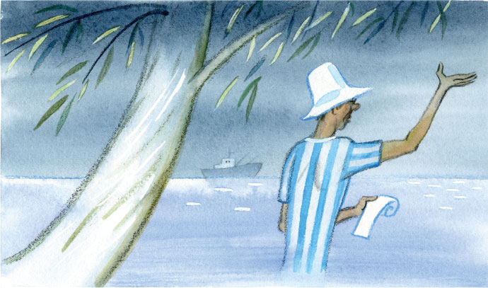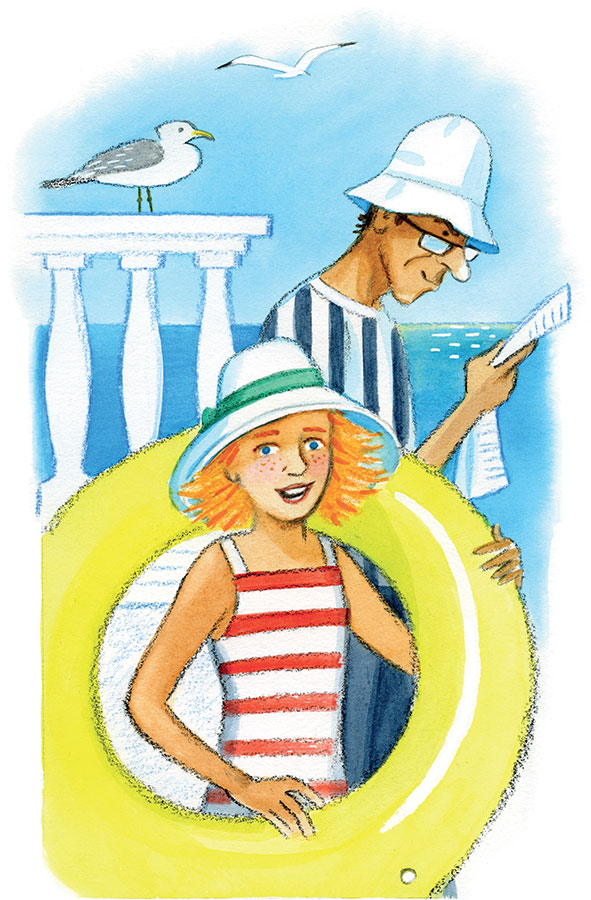 – Здравствуйте, товарищи, – отвечает им папа и скорей, пока жители города не повысыпали из домов, мчится дальше, на море – в этих своих, как я уже говорила, плавках.