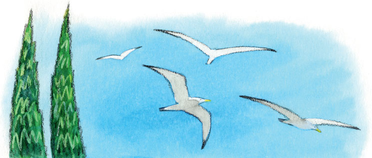 И вот мы на море! И я кормлю чаек вместо зарядки. А море – гладкое, как бритва, с острым горизонтом. Ни волн, ни ветров, одни чайки рано утром шумят на берегу.