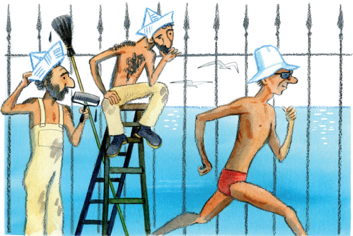 Всё вокруг они заляпали и забрызгали, но мне нравится стоять возле них и нюхать, как пахнет краской. Я вообще бы пошла учиться на маляра. Там ученики – так написано в объявлении – «обеспечиваются парадной формой»! А?! ПАРАДНАЯ ФОРМА МАЛЯРА?! А крутящиеся на палках щитки – под названием халява?! Малярный каток с узорами! Вёдра красок!.. А полёты в люльке?!